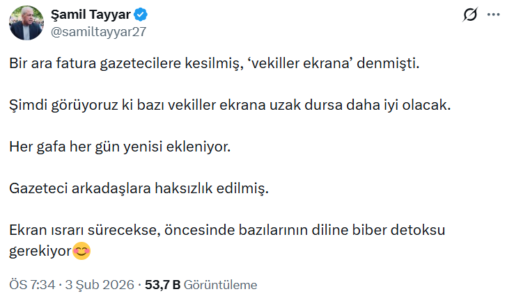 Tepki çeken açıklamaların ardından AKP'li Şamil Tayyar, gazeteciler yerine milletvekillerinin ekrana çıkmasının "gaflar" sonrası gözden geçirilmesini önerdi.