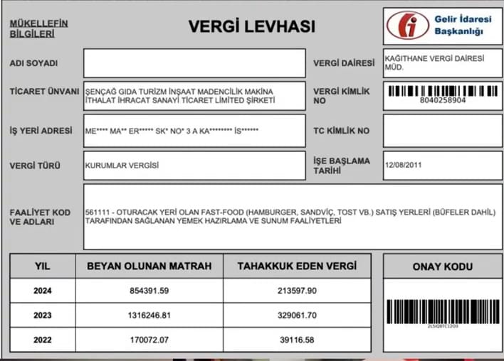 Şençağ şirketi, söz konusu şube üzerinden 2022’de 170 bin TL gelir beyan etti, 39 bin TL vergi ödedi.