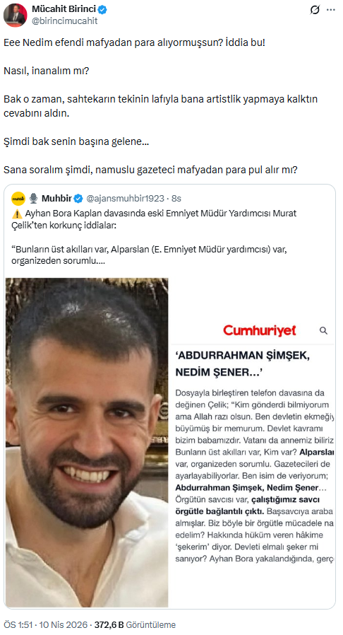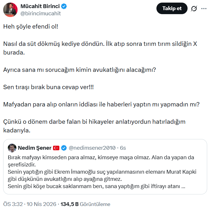 MÜCAHİT BİRİNCİ PAYLAŞTISavunmadaki ifadelerin gündem olmasının ardından eski AKP MKYK üyesi avukat Mücahit Birinci ile gazeteci Nedim Şener arasında polemik yaşandı.