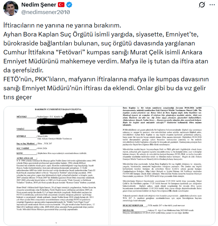"İftiracıların ne yanına ne yarına bırakırım. Ayhan Bora Kaplan Suç Örgütü isimli yargıda, siyasette, Emniyet’te, bürokraside bağlantıları bulunan, suç örgütü davasında yargılanan Cumhur İttifakına “Fetövari” kumpas sanığı Murat Çelik isimli Ankara Emniyet Müdürünü mahkemeye verdim. Mafya ile iş tutan da iftira atan da şerefsizdir. FETÖ’nün, PKK’lıların, mafyanın iftiralarına mafya ile kumpas davasının sanığı Emniyet Müdürü’nün iftirası da eklendi. Onlar gibi bu da vız gelir tırıs geçer."