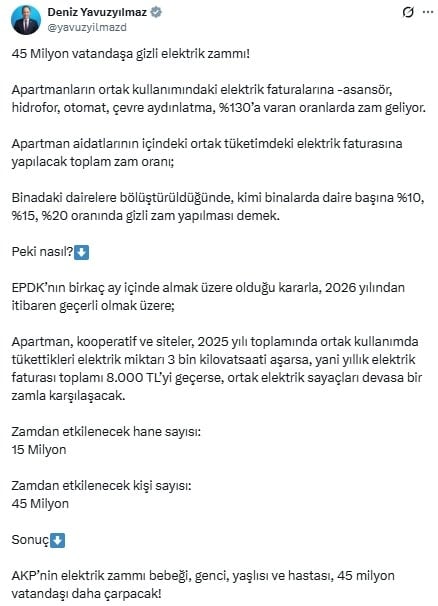CHP Zonguldak Milletvekili Deniz Yavuzyılmaz, EPDK'nın aldığı son kararların ardından 45 Milyon vatandaşın etkilendiği elektriğe gizli zammın detaylarını paylaştı.