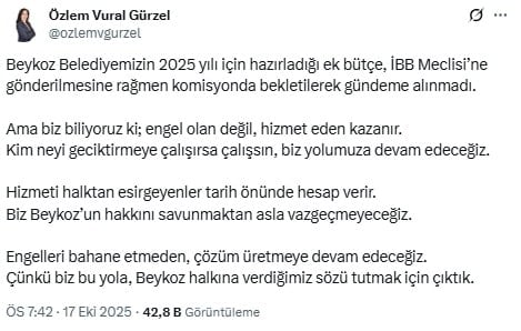 Gürzel resmi X hesabından yaptığı açıklamada Beykoz Belediyesi'nin hazırladığı bütçenin İBB tarafından engellendiğini iddia etti.