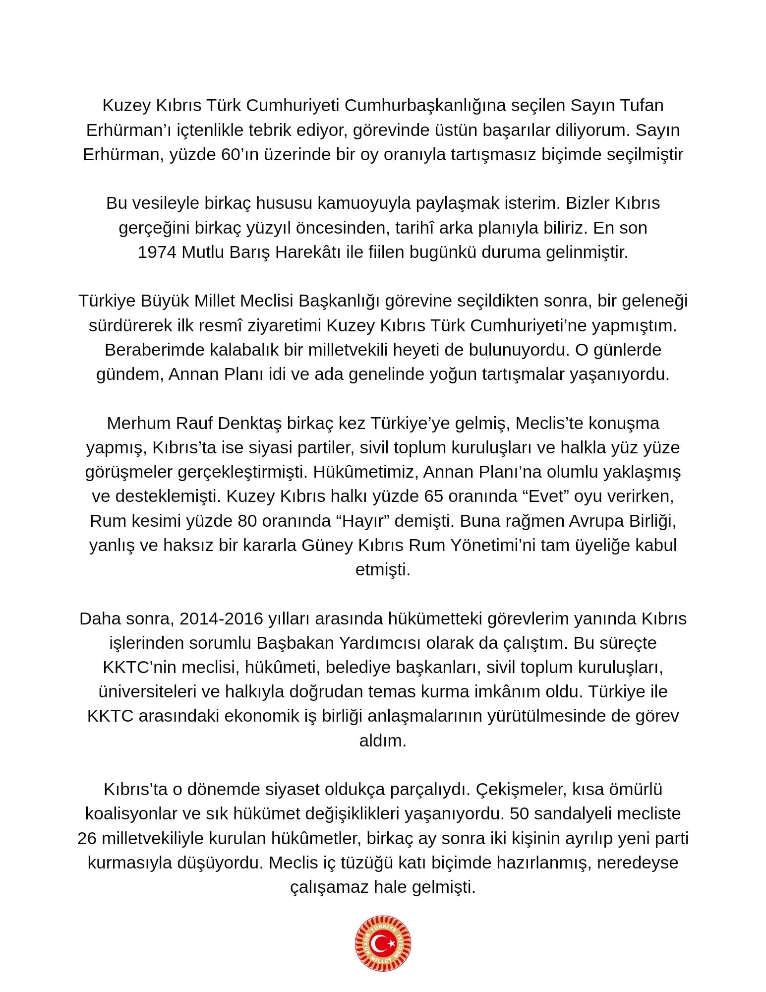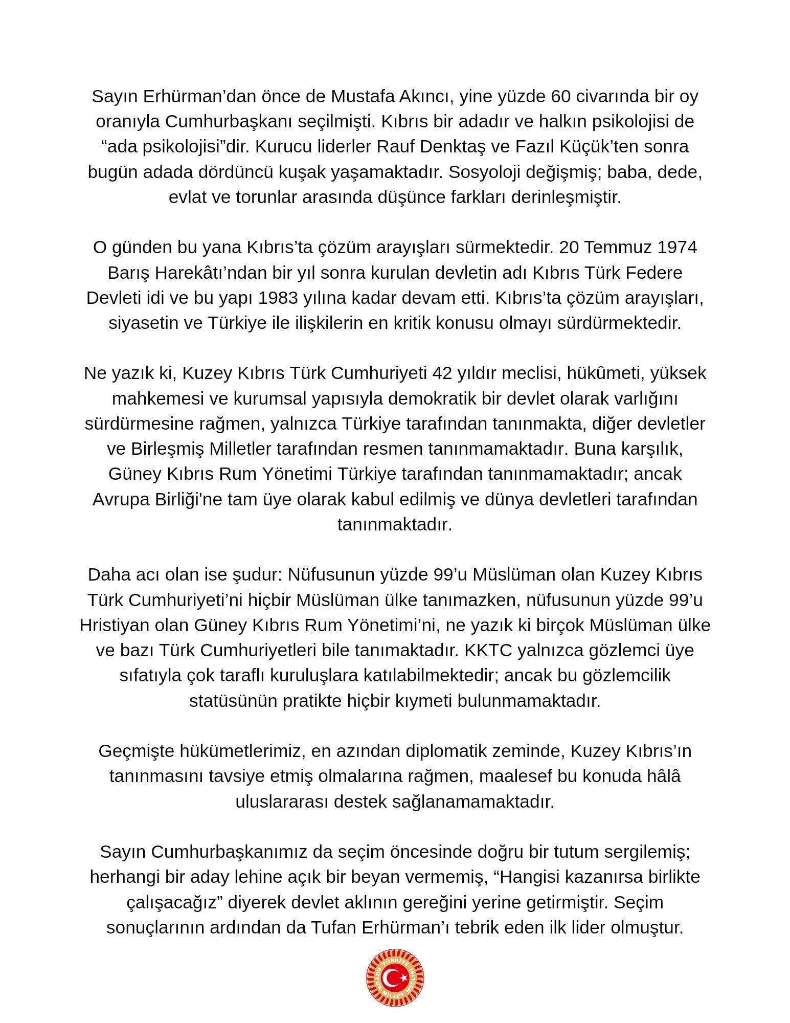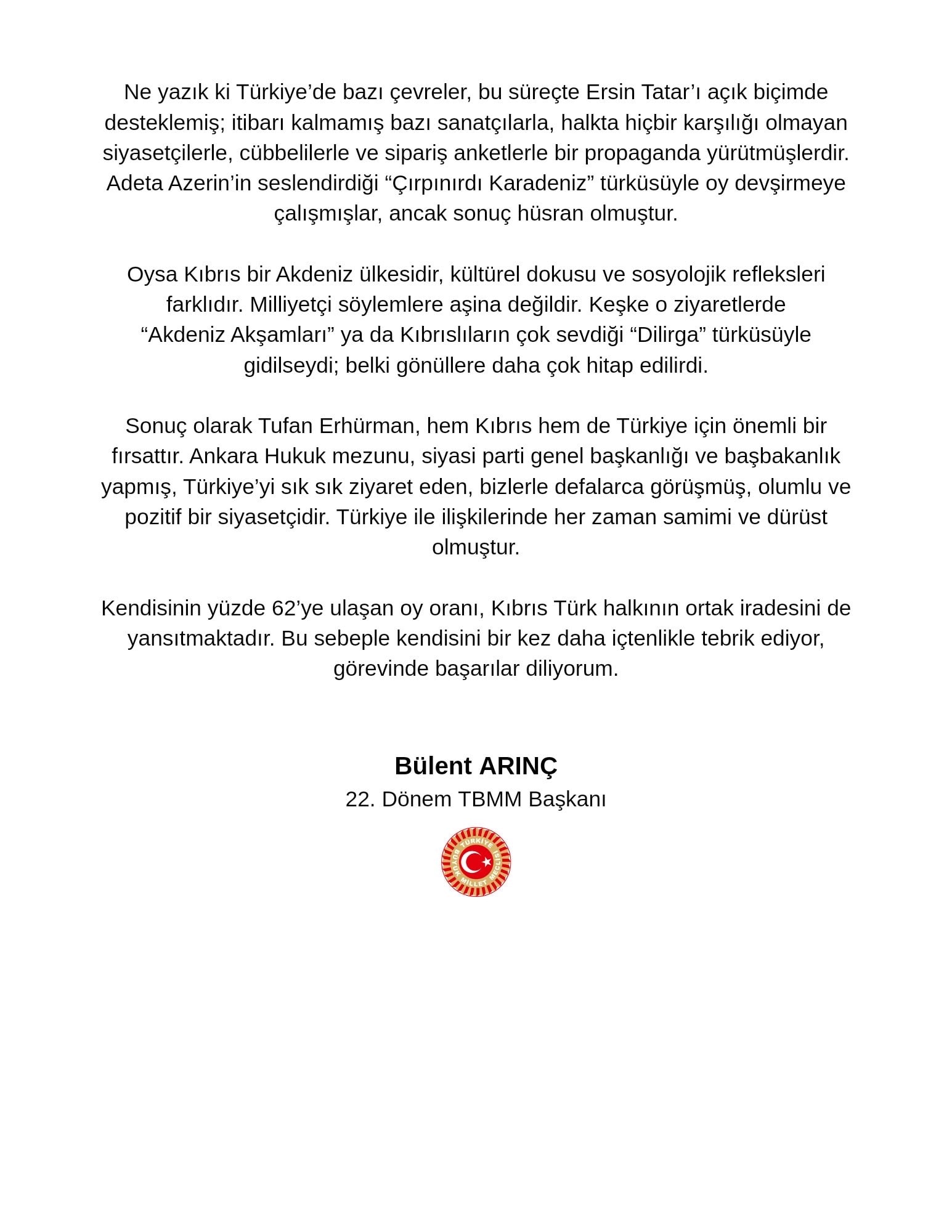 "İTİBARSIZ SANATÇILAR, CÜBBELİLER..."“Ne yazık ki Türkiye'de bazı çevreler bu süreçte Ersin Tatar'ı açık biçimde desteklemiş; itibarı kalmamış bazı sanatçılarla, halkta hiçbir karşılığı olmayan siyasetçilerle, cübbelilerle ve sipariş anketlerle bir propaganda yürütmüşlerdir. Adeta Azerin'in seslendirdiği ‘Çırpınırdı Karadeniz’ türküsüyle oy devşirmeye çalışmışlar, ancak sonuç hüsran olmuştur.”