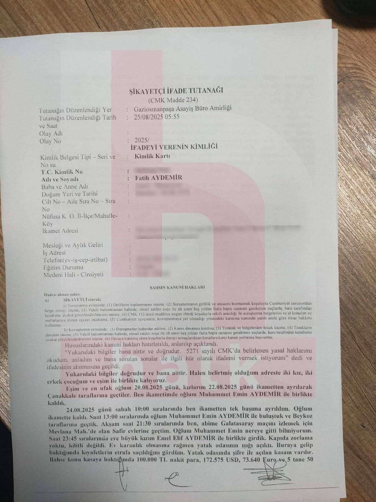 Fatih Aydemir, "kasanın şifresini çocuklarım da biliyor" demişti.OĞLU, PARA DOLU ÇANTA İLE ÇIKMIŞFatih Aydemir’in şikâyeti üzerine savcılık soruşturma başlattı. Polis ekipleri, eve giren çıkanların tespiti için sitenin kameralarını mercek altına aldı. Kamera kayıtları, Muhammet Emin Aydemir’in 24 Ağustos saat 13.00 gibi, sırtında bir çanta ile evden çıktığını ortaya koydu. Aydemir’in evden çıkışından 5 saat kadar sonra, kapıda 2 kişi belirdi. Bu 2 kişinin, Mustafa Erdem ile Hakan Enes Akaslan olduğu belirlendi. Erdem, Aydemir’in kendisine verdiği giriş kartı okutarak içeri girdi.