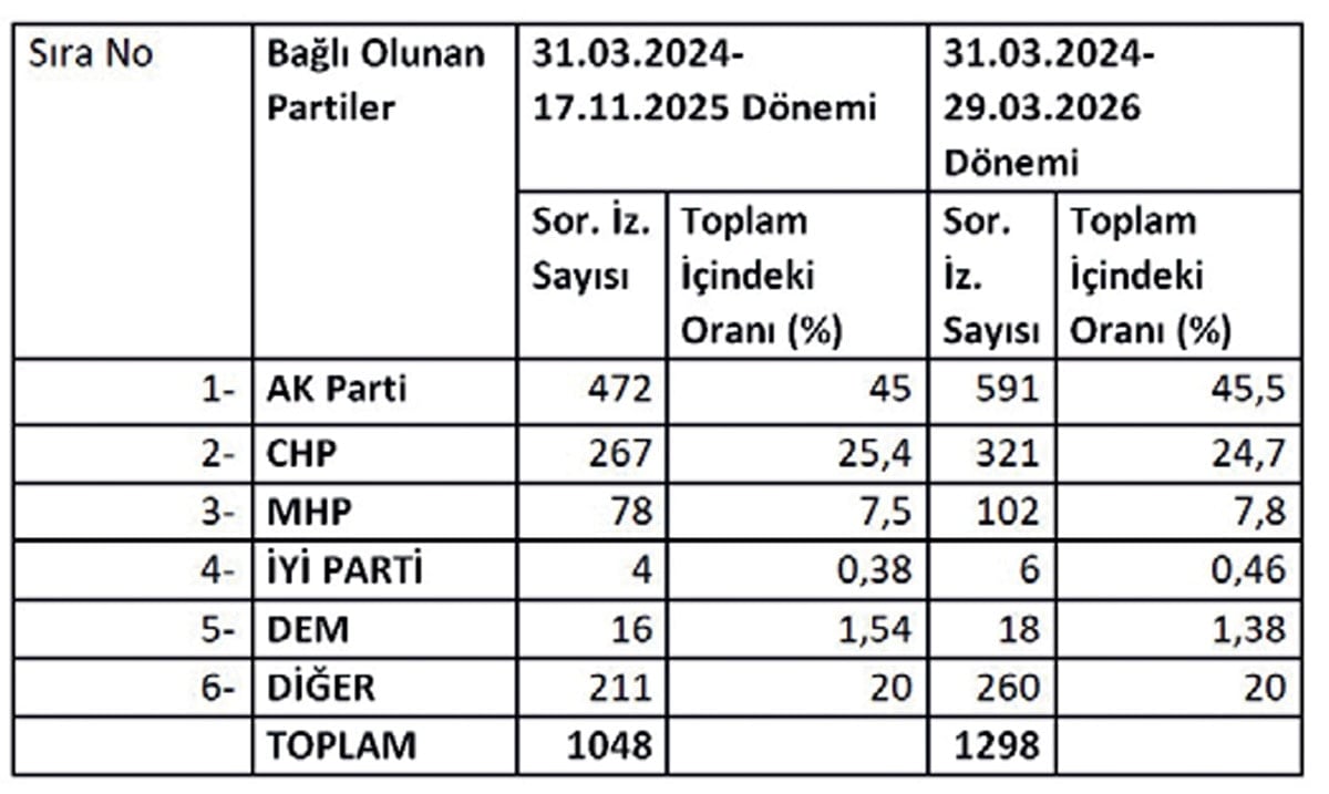 “Seçimlerin yapıldığı 31 Mart 2024’ten günümüze 29 Mart 2026 tarihine kadar toplam 1.048 belediye başkanı hakkında soruşturma izni verildi. Bunların 472’si AK Parti’li (Yüzde 45), 267’si CHP’li, 78’i MHP’li, 4’ü İYİ Partili, 16’sı DEM’li, 201’i de diğer siyasi partiler ve bağımsız başkanlarla ilgili.”