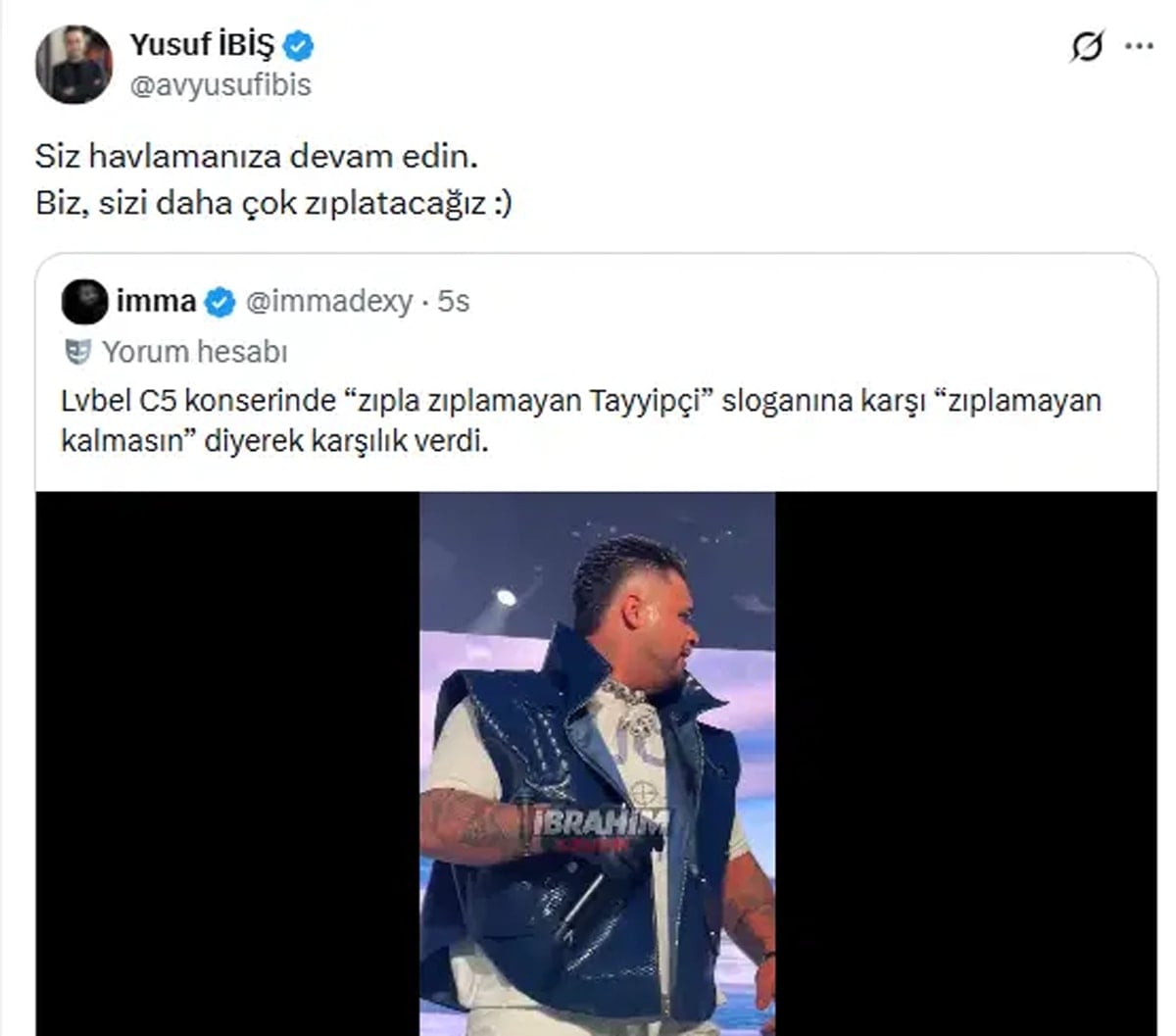 AKP Gençlik Kolları Başkanı Yusuf İbiş, rapçi Lvbel C5'in konserinden "zıplamayan Tayyipçi" sloganlarının olduğu videoyu sosyal medya hesabından paylaştı.