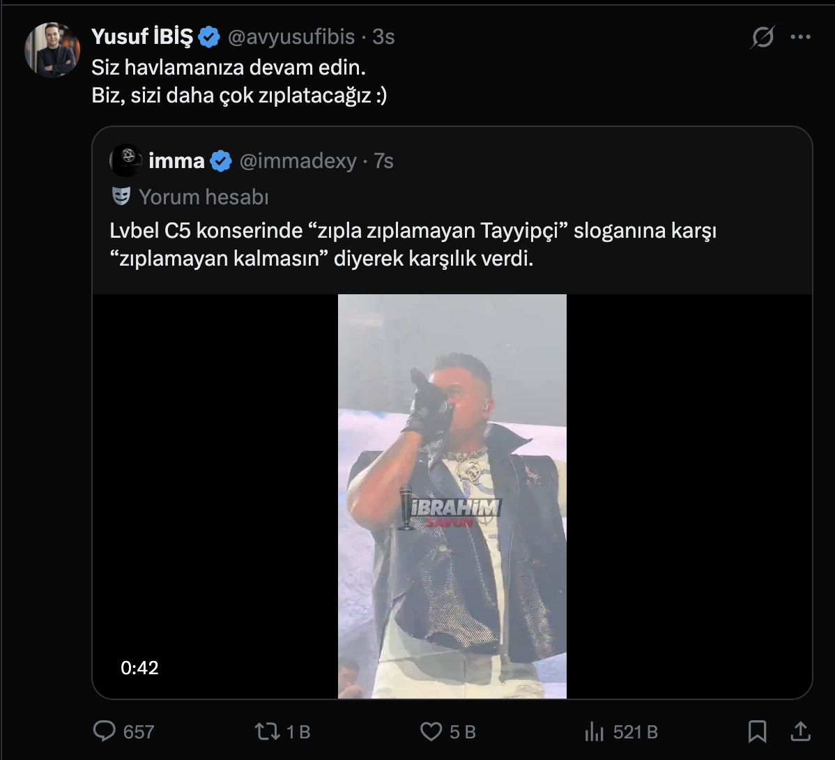 AKP Gençlik Kolları Başkanı Yusuf İbiş, ünlü rapçi Lvbel C5’in konserinden “zıplamayan Tayyipçi” sloganlarının atıldığı ve rapçinin de ‘zıplamayan kalmasın’ dediği videoyu sosyal medya hesabından paylaştı.