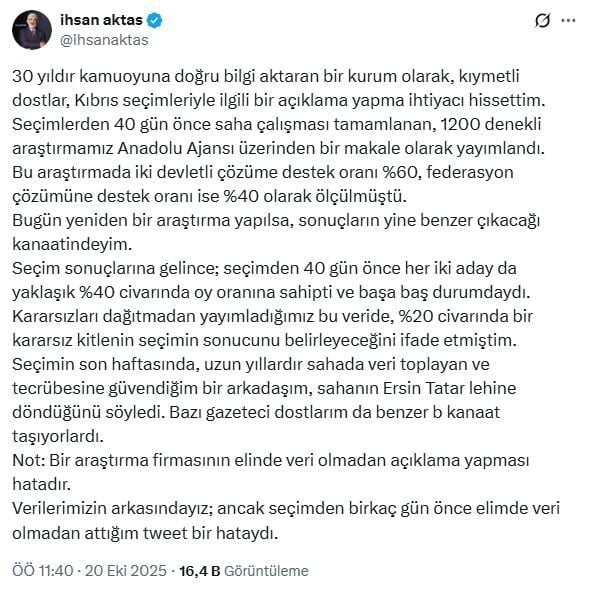 Seçimden önce, “Kıbrıs’ta iki devletli çözümü savunanlar açık ara önde” şeklinde paylaşım yapan GENAR Başkanı İhsan Aktaş, seçim sonuçlarının açıklanmasının ardından X (Twitter) hesabından bir açıklama yayımladı.