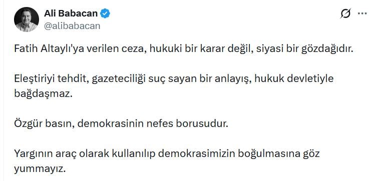 DEVA Partisi Genel Başkanı Ali Babacan, Altaylı'ya verilen cezanın hukuki bir karar olmadığını vurgulayarak, "Özgür basın, demokrasinin nefes borusudur" dedi.