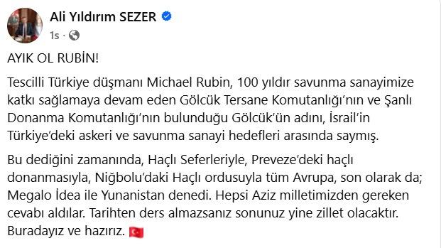 İlçenin Türk savunma sanayisindeki kritik rolüne ve tarihi önemine dikkat çeken Sezer, "Tescilli Türkiye düşmanı Michael Rubin, 100 yıldır savunma sanayimize katkı sağlamaya devam eden Gölcük Tersane Komutanlığının ve Şanlı Donanma Komutanlığının bulunduğu Gölcük'ün adını, İsrail'in Türkiye'deki askeri ve savunma sanayi hedefleri arasında saymış." dedi.