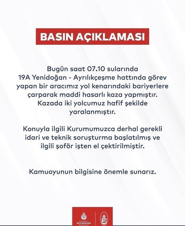 İETT’den yapılan açıklamada, "Bugün saat 07.10 sularında 19A Yenidoğan - Ayrılıkçeşme hattında görev yapan bir aracımız yol kenarındaki bariyerlere çarparak maddi hasarlı kaza yapmıştır. Kazada iki yolcumuz hafif şekilde yaralanmıştır. Konuyla ilgili Kurumumuzca derhal gerekli idari ve teknik soruşturma başlatılmış ve ilgili şoföre işten el çektirilmiştir" denildi.