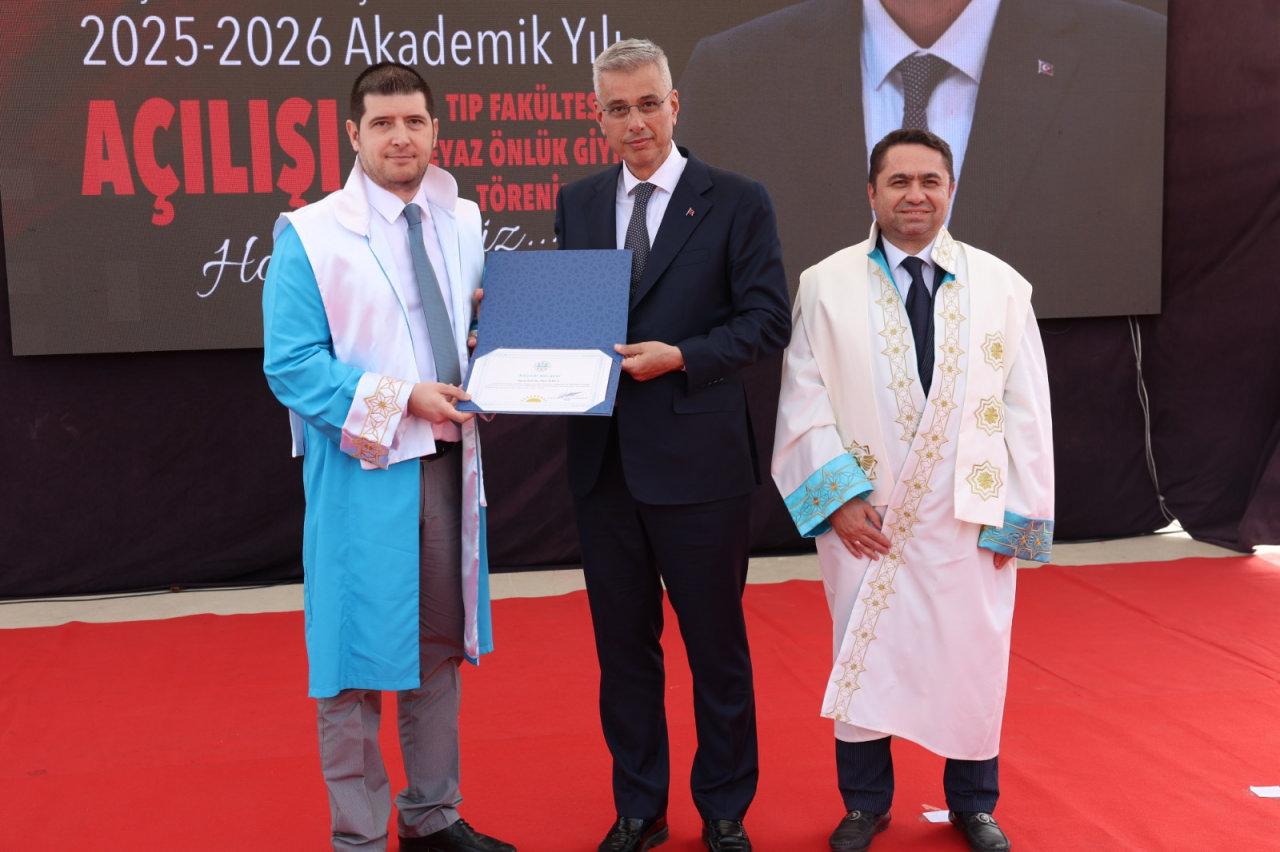 Başarı belgelerinin takdiminden sonra Rektör Türkdoğan Bakan Memişoğlu’na cübbe giydirdi. Programda tıp fakültesi öğrencilerine Bakan Memişoğlu ve protokol üyeleri tarafından beyaz önlük giydirildi.