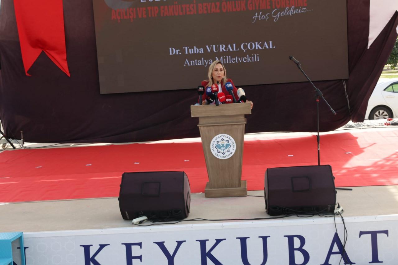 Antalya Milletvekili Tuba Vural Çokal konuşmasında yeni dönemin başarılar getirmesini diledi. Milletvekili Çokal, "O beyaz önlük bilgiyle birlikte vicdanın, teknikle birlikte de merhametin sembolüdür. Bir hastanın ilk teşekküründe bir hekimin kalbi biraz daha büyür ve o büyüme bilgiyle değil insanla olur. Sevgili genç meslektaşlarım, bugün giydiğiniz beyaz önlük hayatınız boyunca temiz tutmaya çalışacağınız bir vicdanın simgesidir. Bir gün elleriniz titrerken bile bir hastanın gözünde umut ışığı varsa bilin ki bu mesleği doğru yapıyorsunuzdur. Bu kutsal yolculukta bize rehberlik eden, emeğiyle ve sabrıyla bizi yetiştiren çok kıymetli hocalarımızı da canı gönülden teşekkür ediyorum. Çok kutsal bir mesleğin başlangıcındasınız. Hepinizin yolu açık olsun." dedi.
