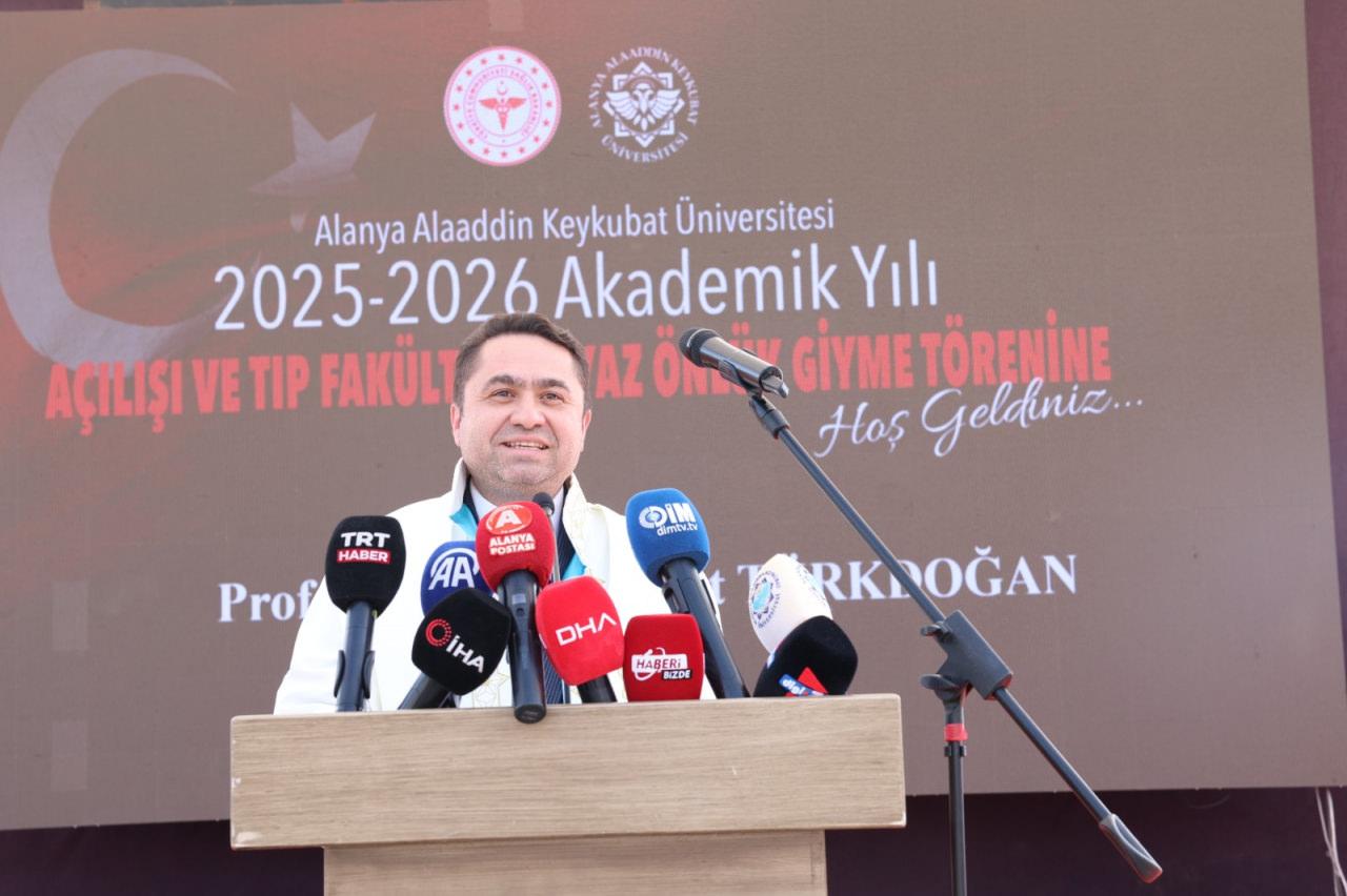 Alanya’nın bilimsel gelişmeler sayesinde sadece turizmin değil aynı zamanda bilimin merkezi olduğunun altını çizen Rektör Türkdoğan, "Yarın daha güçlü bir sağlık kampüsü, daha ileri teknoloji merkezleri ve daha geniş bir üniversite vizyonu ile yolumuza devam edeceğiz. Bu süreçte özellikle sağlık alanındaki büyümemizde; katkıları, destekleri ve varlığıyla bizlere her daim destek ve güç veren Sayın Sağlık Bakanımıza üniversitemiz adına teşekkürlerimi sunuyorum. Hep birlikte; araştıran, üreten ve dünyaya katkı sunan bir üniversite olma yolunda kararlılıkla yürüyeceğiz. Sevgili Öğrencilerimiz, Sizler bu üniversitenin, bu şehrin ve bu ülkenin geleceğisiniz. Unutmayın! Bilim cesaret, sabır, inanç ister. Biz size inanıyoruz. Bu dönemde gençliğe, eğitime ve sağlığa verilen önem ve yatırımlar asla göz ardı edilemez. Sayın Cumhurbaşkanımıza şükranlarımı arz ederim. Yeni akademik yılın üniversitemize, şehrimize ve ülkemize bilim, başarı, bereket ve hayırlar getirmesini diliyor; başarılarımızın mimarı tüm akademisyenlerimize, idari personelimize ve öğrencilerimiz nezdinde tüm ailelere teşekkür ediyorum." dedi.