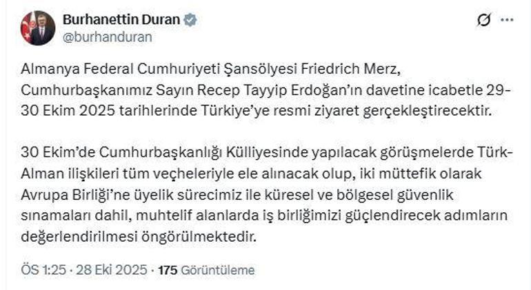 İletişim Başkanı Burhanettin Duran, sosyal medya hesabından yaptığı açıklamada, "Almanya Federal Cumhuriyeti Şansölyesi Friedrich Merz, Cumhurbaşkanımız Sayın Recep Tayyip Erdoğan'ın davetine icabetle 29-30 Ekim 2025 tarihlerinde Türkiye'ye resmi ziyaret gerçekleştirecektir. 30 Ekim'de Cumhurbaşkanlığı Külliyesinde yapılacak görüşmelerde Türk-Alman ilişkileri tüm veçheleriyle ele alınacak olup, iki müttefik olarak Avrupa Birliği'ne üyelik sürecimiz ile küresel ve bölgesel güvenlik sınamaları dahil, muhtelif alanlarda iş birliğimizi güçlendirecek adımların değerlendirilmesi öngörülmektedir" dedi.