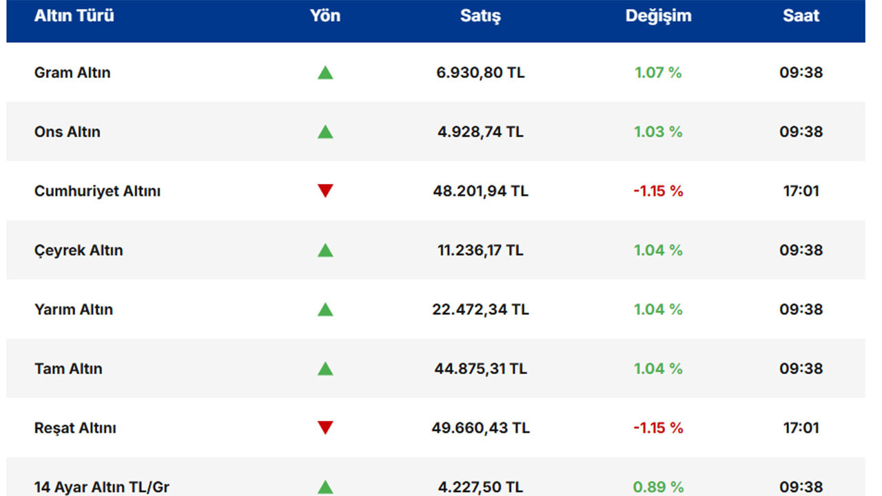 Güne 4 bin 877 dolardan giriş yapan ons altın, günün en düşük seviyesi olan 4 bin 854 doları test ettikten sonra 4 bin 931 dolara kadar çıktı. Gram altın ise güne 6 bin 858 liradan başladı. Gün içerisinde en yüksek 6 bin 934 lirayı gören gram altın, şu sıralarda 6 bin 928 lira seviyelerinden alıcı buluyor.