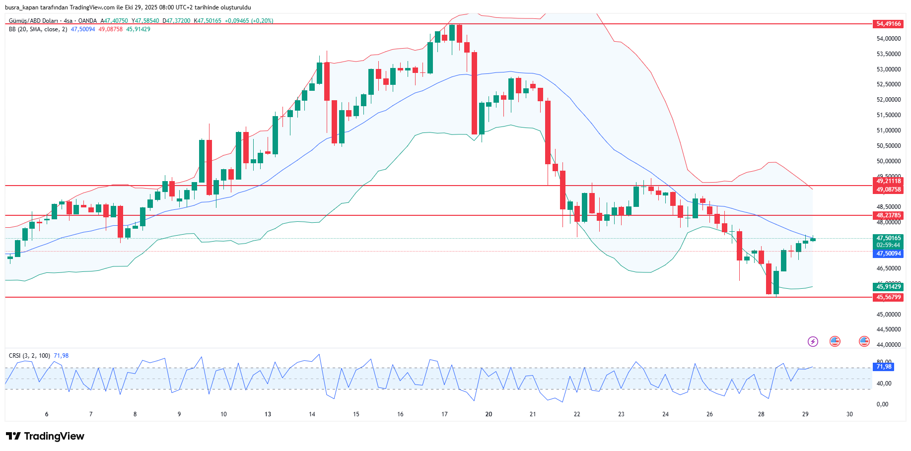 GÜMÜŞTE SON DURUMOns gümüş rekor yükselişlerinin ardından son günlerde sert kayıplar verdi. Ons gümüş 45,56 dolara kadar düştü. Dün akşam seansında yeniden yönünü yukarı çevirerek sabah seansında 08.46'da 47,50 dolarda bulunuyor.