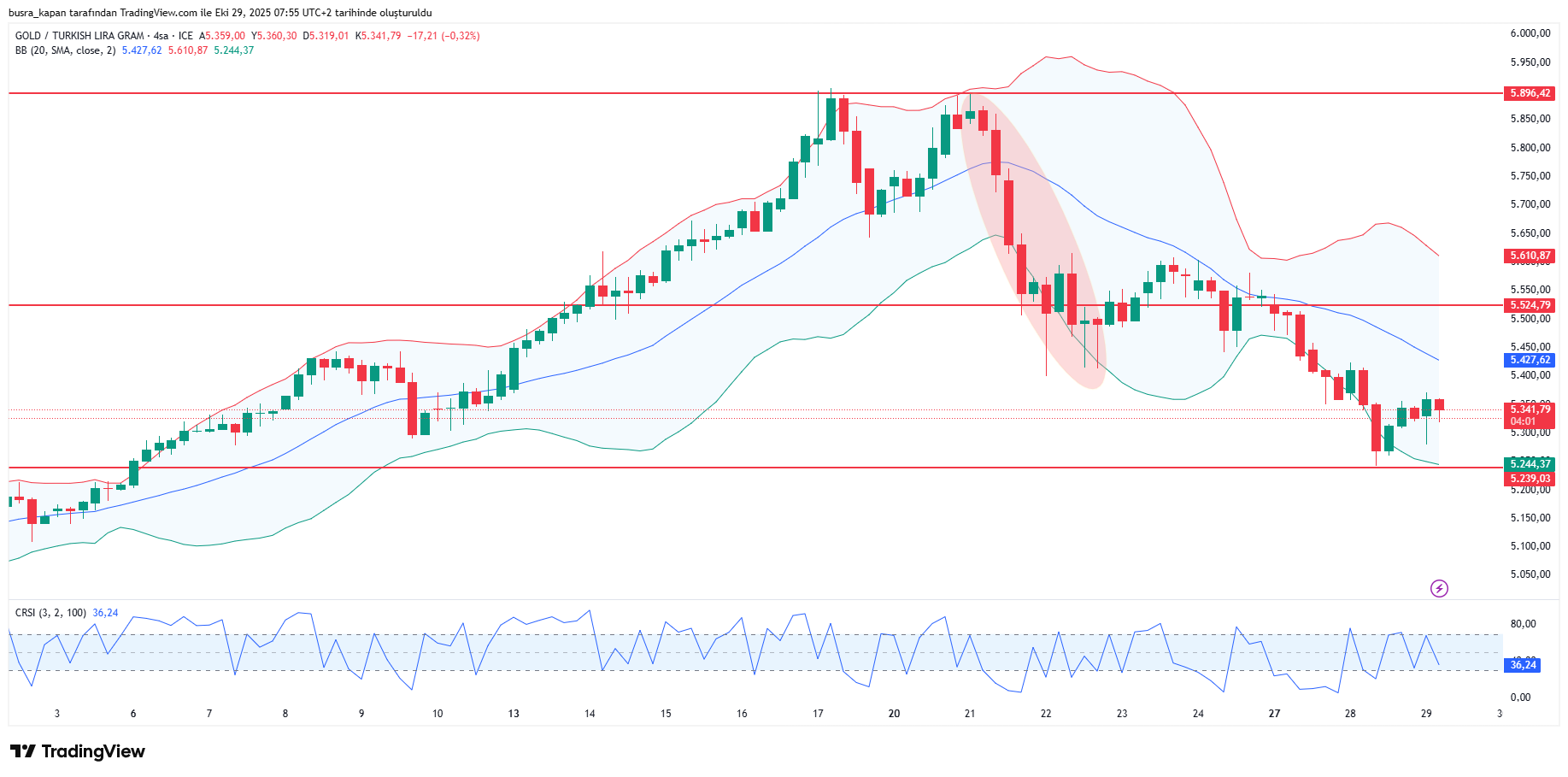Ons altında görülen sert düşüşle ve dolar/TL kurundaki yatay seyrin etkisiyle gram altın sert düşüş yaşadı. Gram altın resmi rakamlarda 5 bin 239 liraya kadar geriledi. Yeni günde sabah seansında 08.46'da 5 bin 340 lirada bulunuyor.