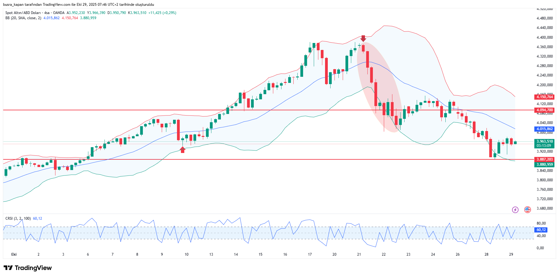 Ons altın son bir haftadır kazançlarını silerek, aşağı yönlü sert hareketlenmeler yaşanıyor. Ons altın dün 3 bin 881 dolara geriledi. Yeni günde sabah seansında 08.46'da 3 bin 962 dolarda bulunuyor.