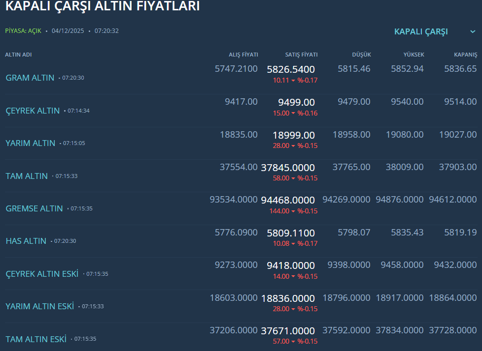 Kapalı Çarşı'da altın fiyatları ise 5 bin 827 liradan satılıyor.