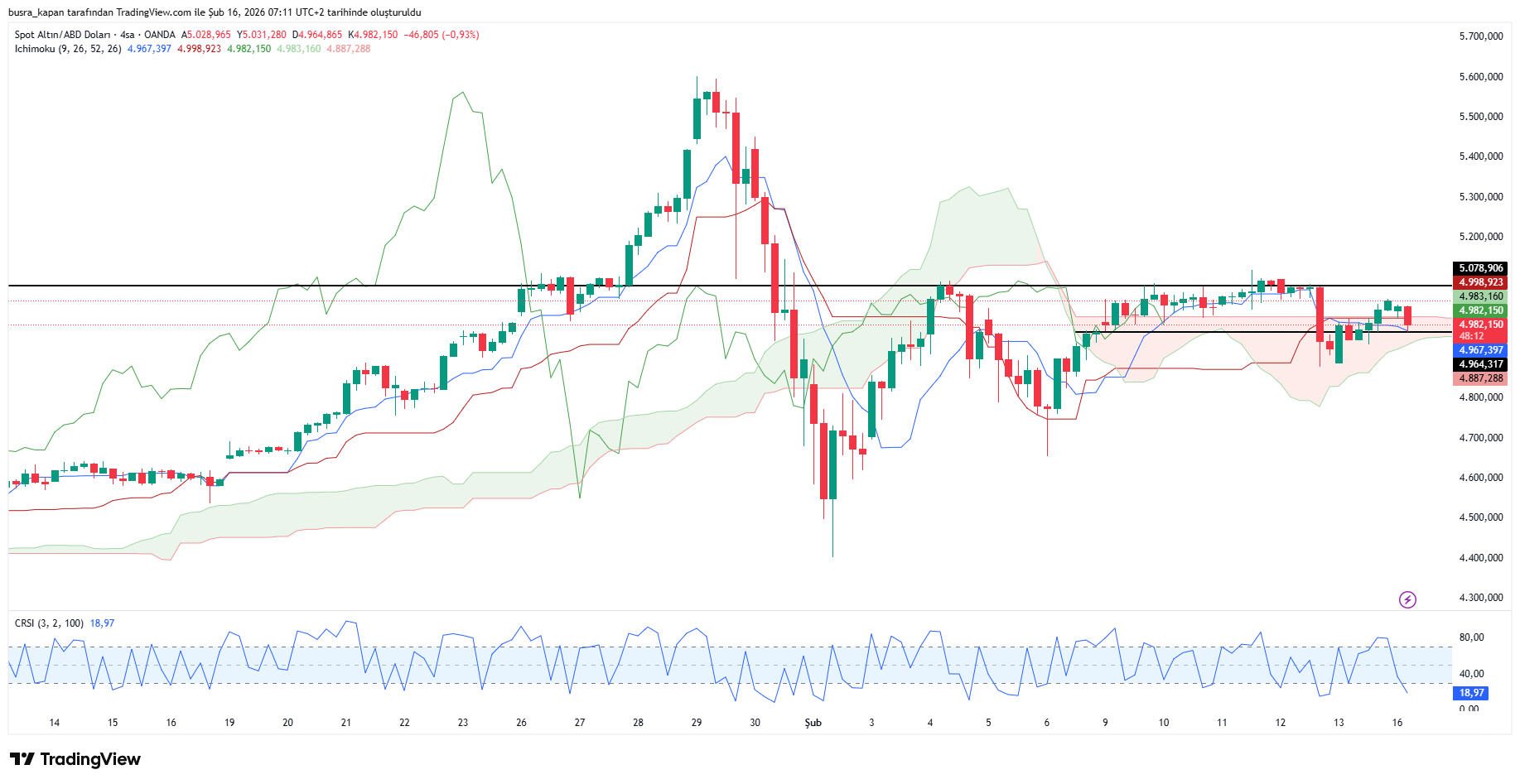 ALTINI ALINIR MI, SATILIR MI?Ekonomist Tuncay Turşucu ise sarı metalin 30 Ocak tarihindeki büyük düşüşün etkilerini yaşamaya devam ettiğini belirterek, “Momentumda bir zayıflık var. Ancak bu, altını yatay seyirde tutuyor. Dolar endeksi de 95-98 arasında dalgalanıyor. Ons altın için 5.600 dolar seviyesini bir süre zirve olarak izleyeceğiz. Aşağıda ise 50 günlük ortalama destek olacaktır” değerlendirmesinde bulunarak, mevcut altın pozisyonlarının korunabileceğini ancak yeni bir pozisyon için ise acele edilmemesi gerektiğini vurguladı.