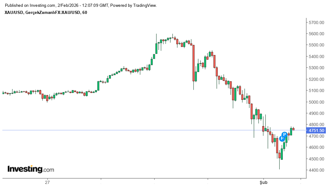 Ons altın perşembe günü 5 bin 598 dolara kadar yükselerek rekor tazeledikten sonra, 4 bin 402 dolara kadar keskin bir düşüş gösterdi. Ons altın perşembeden bu yana bin 1986 dolar birden düştü. Ancak bugün 13.55 itibarıyla düşüşlerini dizginleyen ons altın yeniden toparlayarak 4 bin 758 dolara yükseldi.