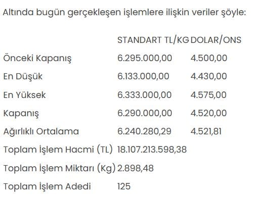 KMKTP'de altında toplam işlem hacmi 18 milyar 107 milyon 213 bin 598,38 lira, işlem miktarı ise 2 bin 898,48 kilogram oldu.
