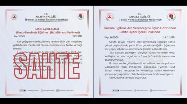 Amasya Valiliği’nden yapılan açıklamada, İl Basın ve Halkla İlişkiler Müdürlüğü tarafından yapılmış gibi gösterilen ‘kar tatili’ paylaşımlarının asılsız olduğu ifade edildi. Açıklamada, “Çeşitli sosyal medya platformlarında sahte görsel paylaşılarak yarın ilimiz genelinde eğitim öğretime kar yağışı sebebiyle ara verileceği iddia edilmektedir. Söz konusu paylaşım gerçeği yansıtmamakta olup, valiliğimizin basın açıklaması formatı üzerinde oynanarak oluşturulmuştur” denildi. Bugün eğitime ara verileceği öne sürülen sahte görsellere itibar edilmemesi gerektiği de vurgulanarak, yalnızca Amasya Valiliği’nin resmi sanal medya hesapları ile WhatsApp kanalı üzerinden yapılan duyuruların dikkate alınması gerektiği belirtildi.