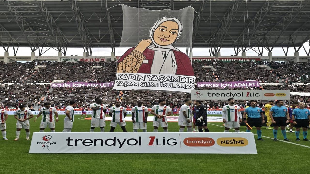 AMEDSPORLU TARAFTARLARDAN ROJİN POSTERİAmedspor taraftar grupları, tribünlerde Rojin Kabaiş’in dev posterini açtı. "Kadın yaşamdır, yaşam susturulamaz" yazılı koreografi müzik eşliğinde sergilendi. Aynı anda tribünlerde alkışlar yükseldi. Rojin Kabaiş’in ailesi de tribünde maçı izleyenler arasında yer aldı.