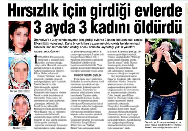 “CİNAYETLERİ BEN İŞLEMEDİM” DEDİGözaltına alınan Efkan B.’nin evinde yapılan aramalarda farklı ebat ve şekillerde çok sayıda bıçak bulundu. Ayrıca peruklar başta olmak üzere çeşitli kamuflaj malzemeleri de ele geçirildi.