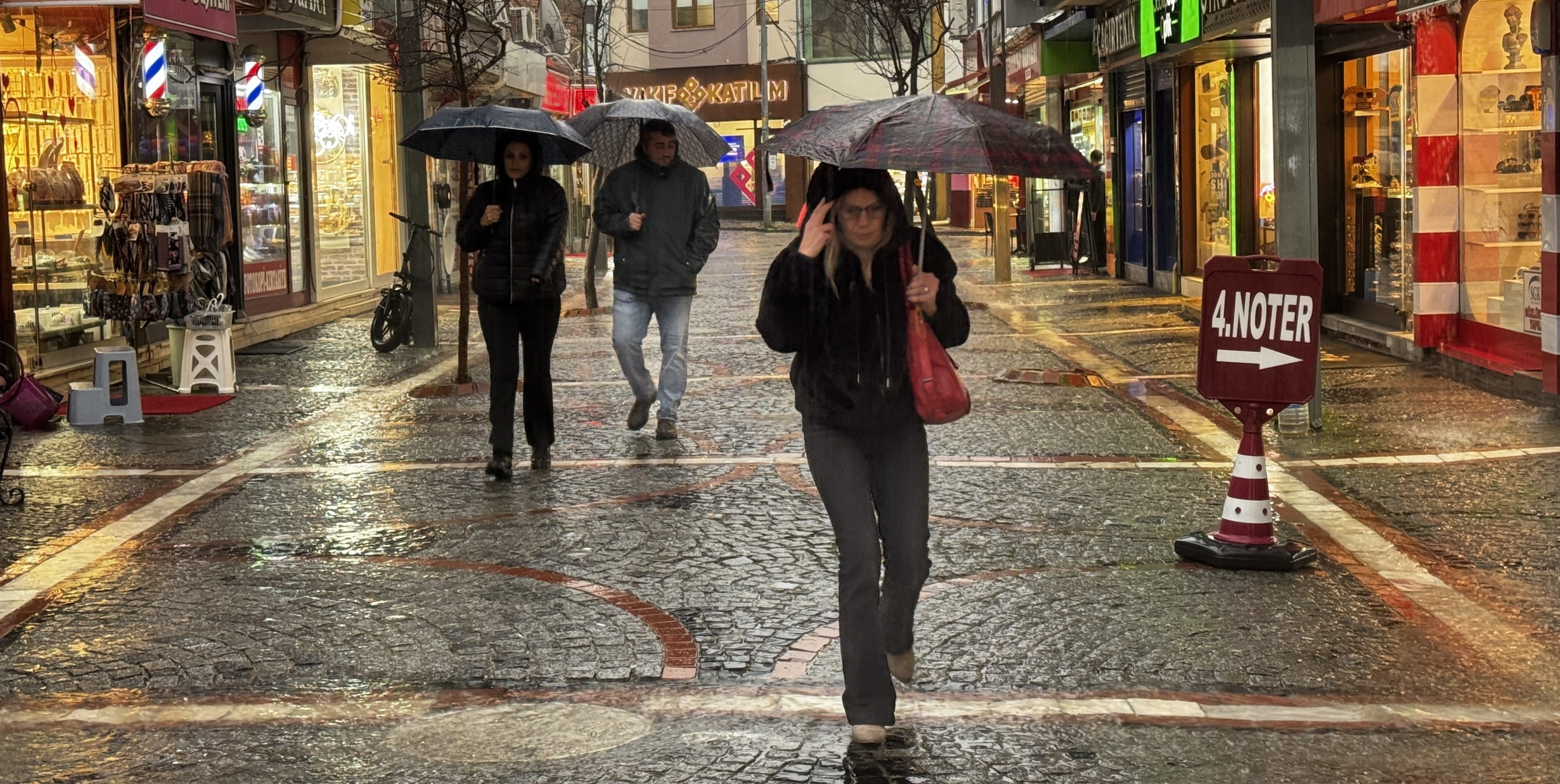 Hava sıcaklığının 11 derece ölçüldüğü kentte aniden bastıran yağmur kısa sürede cadde ve sokaklarda su birikintilerine neden oldu.