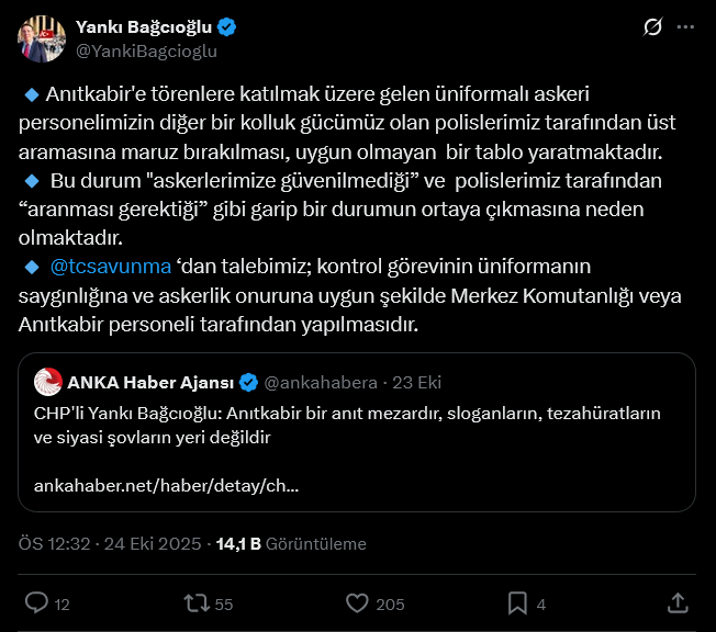 "Anıtkabir'e törenlere katılmak üzere gelen üniformalı askeri personelimizin diğer bir kolluk gücümüz olan polislerimiz tarafından üst aramasına maruz bırakılması, uygun olmayan bir tablo yaratmaktadır.