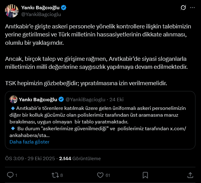 “Anıtkabir’e girişte askeri personele yönelik kontrollere ilişkin talebimizin yerine getirilmesi ve Türk milletinin hassasiyetlerinin dikkate alınması, olumlu bir yaklaşımdır. Ancak, birçok talep ve girişime rağmen, Anıtkabir’de siyasi sloganlarla milletimizin milli değerlerine saygısızlık yapılmaya devam edilmektedir. TSK hepimizin gözbebeğidir; yıpratılmasına izin verilmemelidir."