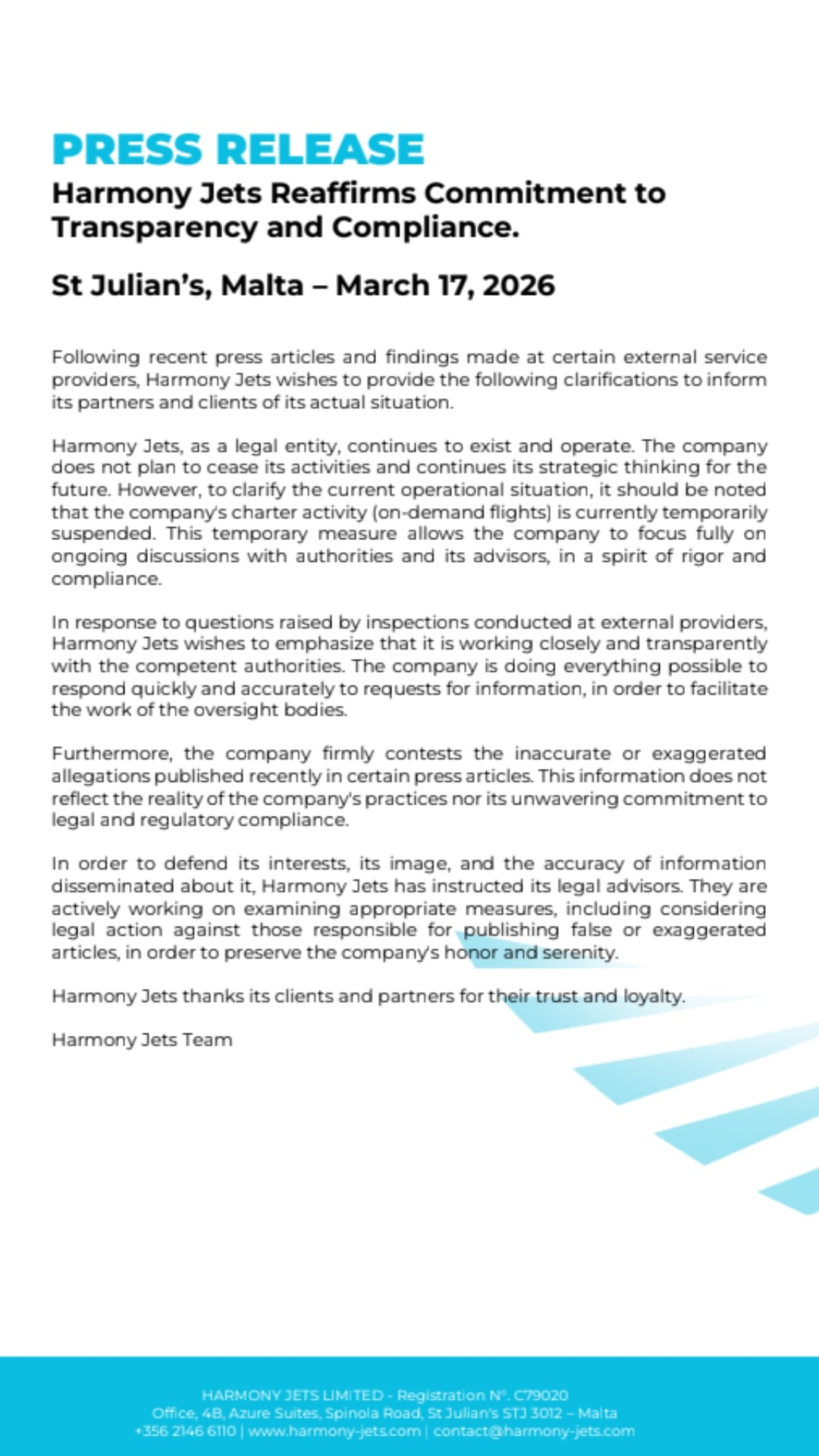 Kamuoyunda şirketin iflas ettiği veya tamamen kapandığı yönünde oluşan algı üzerine Harmony Jets'ten bir açıklama geldi. Hukuki varlıklarının devam ettiğini belirten şirket, yalnızca "charter" olarak bilinen özel talep uçuşlarını geçici süreliğine durdurduklarını duyurdu. Şirket yönetimi, bu kararın yetkili mercilerle yürütülen hukuki sürece ve soruşturmaya tam odaklanabilmek amacıyla alındığının altını çizdi.