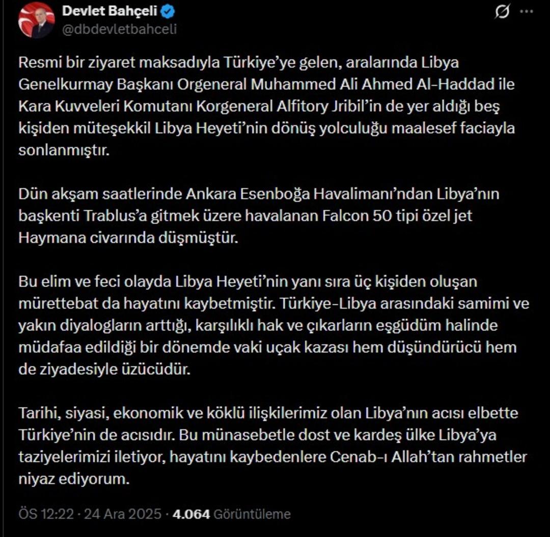 MHP LİDERİ BAHÇELİ'DEN AÇIKLAMAKonu kısa sürede gündemin en üst sıralarına otururken, art arda açıklamalar geldi. MHP Gene Başkanı da düşen uçakla ilgili bir paylaşımda bulundu.