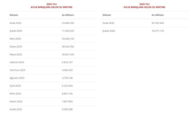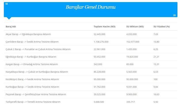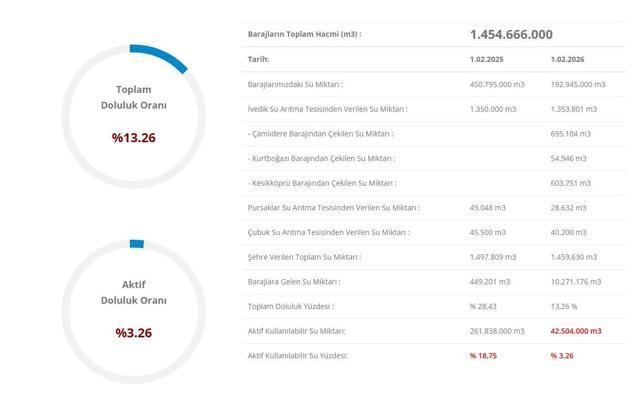 20 Ocak itibarıyla barajların toplam doluluk oranı yüzde 12,62 olarak ölçülürken, kullanılabilir aktif su oranı ise yüzde 1,40 seviyesindeydi. 1 Şubat'ta ise barajların toplam doluluk oranı yüzde 13,26, aktif kullanılabilir su oranı ise 42 milyon 504 bin metreküp ile yüzde 3,26 oldu.