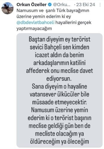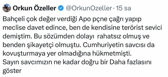 Bu tepkinin, daha önce atmış olduğum ve iki ay tutuklu kalmama neden olan, “MHP Genel Başkanı Sayın Devlet Bahçeli’ye bağlı kişiler ile Abdullah Öcalan’a bağlı teröristleri aynı düzlemde gösterdiği” iddia edilen X paylaşımımla bağlantılı olduğunu değerlendiriyorum. Bunu, samimiyetinden şüphe etmediğim MHP’li ve Ülkücü vatansever arkadaşlarımızın ve büyüklerimizin bana ilettiği geri bildirimlerden anladım.