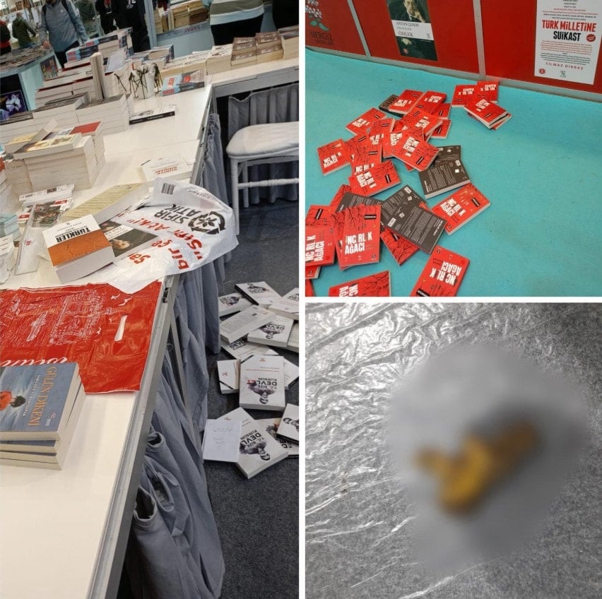 DIŞKI BIRAKTILARÜlkücü bir grubun yayınevi sahibi Ahmet Acar’ı darbedip kitapları dağıttığı, ayrıca standa dışkı bıraktığı öğrenildi. Saldırıdan önce de yine bir grubun yayınevinin standına gelerek tehdit ettiği görüntüler ortaya çıktı.