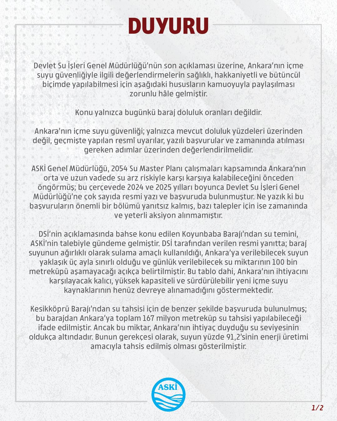 “ASKİ, Ankara’nın orta ve uzun vadede su arz riskiyle karşı karşıya kalabileceğini öngörmüş, 2024 ve 2025 yılları boyunca Devlet Su İşleri Genel Müdürlüğü’ne çok sayıda başvuruda bulunmuştur. DSİ’ye yapılan başvuruların önemli bölümü yanıtsız kalmıştır. Talepler için ise zamanında ve yeterli aksiyon alınmamıştır.”