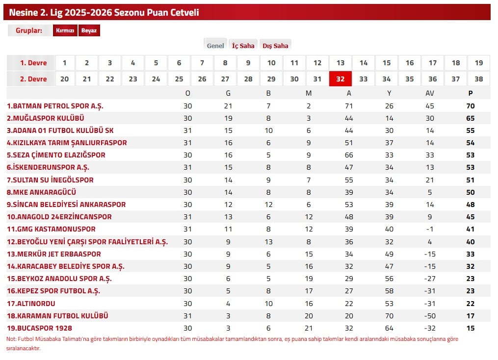 ANKARAGÜCÜ 9. SIRAYA GERİLEYECEKTFF 2. Lig Beyaz Grup’ta play-off gitmek için kenetlenen Ankaragücü’nde gelen puan silme cezası şok etkisi yarattı. Halihazırda 50 puanla 8. sırada yer alan Ankaragücü, rakiplerin gerisine düşecek. 47 puana gerileyecek olan Başkent ekibi 9. sırada yer alacak.