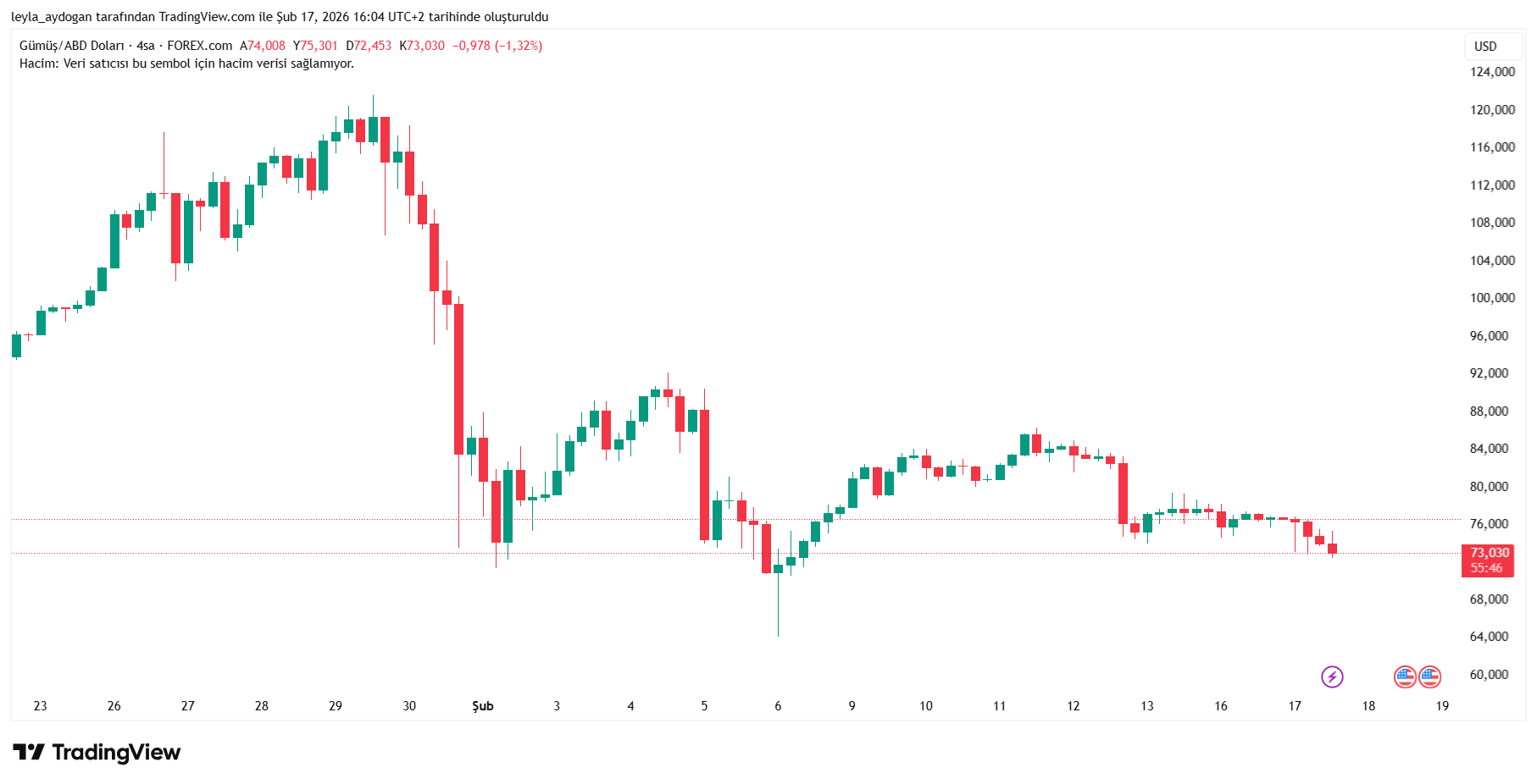 Gümüş fiyatları da düşüş gösterdi. ABD - İran görüşmesi öncesinde 74,91 dolarda bulunuyordu. Görüşmelerin ardından 72,70 dolara geriledi.