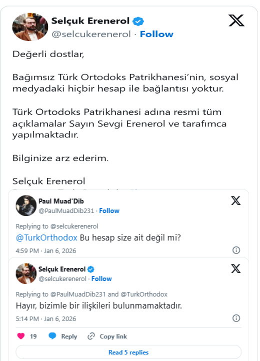 Öte yandan Bağımsız Türk Ortodoks Patrikhanesi'nin Sözcüsü Selçuk Erenerol, söz konusu oluşumun kendileriyle ilgisi olmadığını söyledi.