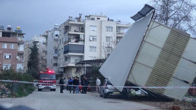 Fırtına nedeniyle Muratpaşa ilçesinde bir iş yerinin konteyner sundurması, park halindeki bir aracın üzerine devrildi. Olayda can kaybı yaşanmazken araçta hasar meydana geldi.