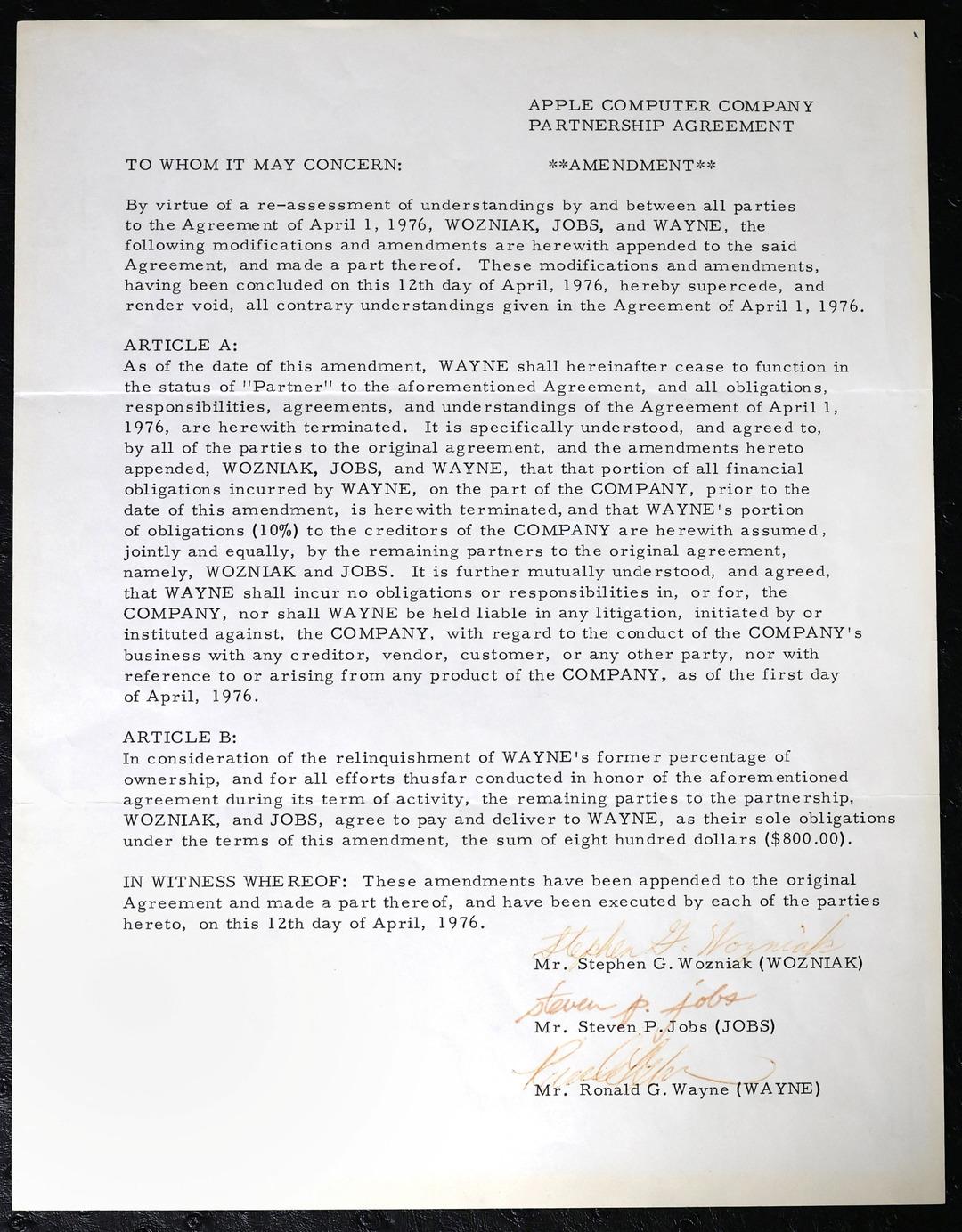 Şirket her ne kadar 1 Nisan 1976’da kurulmuş olsa da anlaşma uzun ömürlü olmamıştı. 12 Nisan’da Wayne desteğini çekmişti. Wayne'in bu kararı ise tarihin en kötü iş hayatı kararlarından biri olarak görülüyor. Çünkü Wayne'in o dönemki payı, Apple’ın mevcut piyasa değeri temel alındığında bugün yüzlerce milyar dolar ediyor.