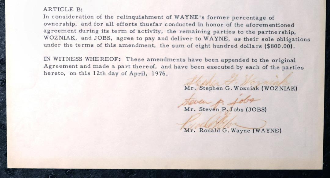 Apple Insider’ın aktardığına göre, şirketteki ilk pay dağılımı Jobs ve Wozniak için yüzde 45’er, Wayne için yüzde 10 olarak belirtilmiş.
