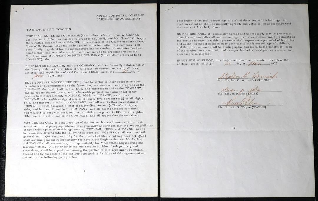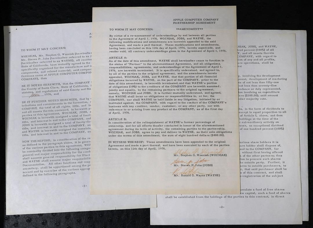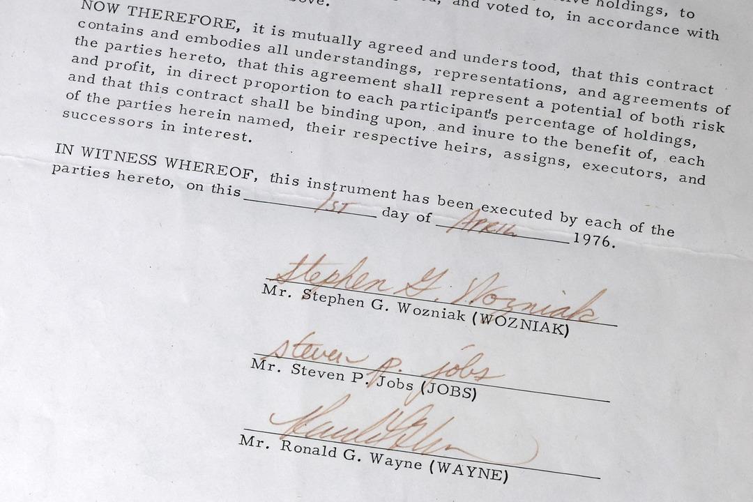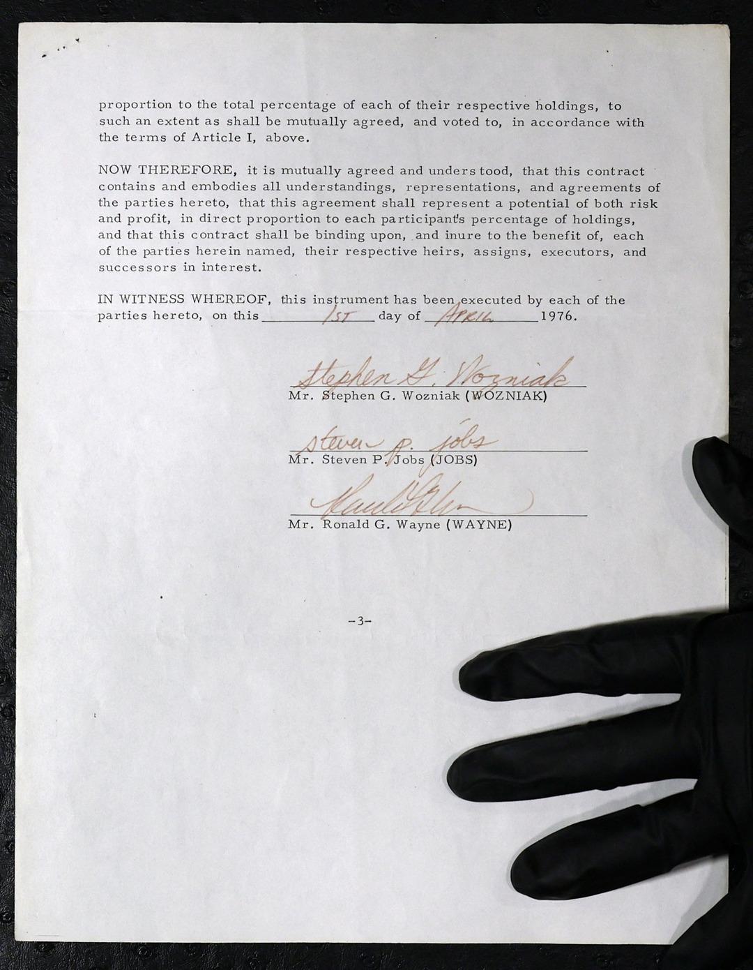 STEVE JOBS, STEVE WOZNIAK VE RON WAYNE’İN İMZASI VAR3 sayfalık belgede Steve Jobs, Steve Wozniak ve Ron Wayne’in imzaları yer alıyor. Bunun yanı sıra belgelerde bu isimlerin şirketteki paylarına da yer veriliyor.