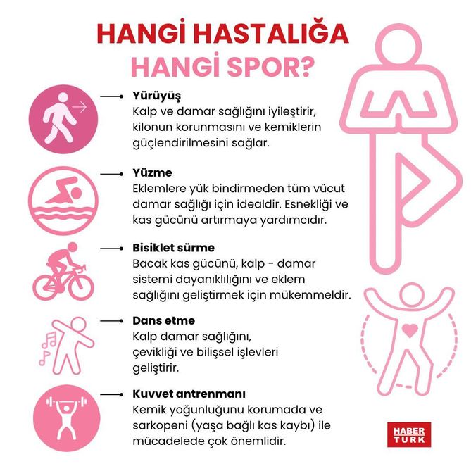 HANGİ HASTALIĞA HANGİ SPOR?Yürüyüş: Kalp ve damar sağlığını iyileştirir, kilonun korunması ve kemiklerin güçlendirilmesini sağlar.