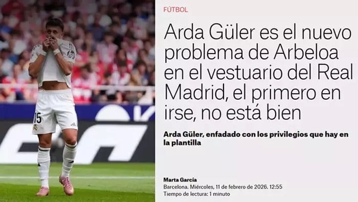 Elnacional'de 'Arda Güler, Real Madrid Soyunma Odasında Arbeloa'nın Yeni Problemi' başlığıyla yayınlanan makalede Arda Güler'in son dönemde aldığı forma süresinden rahatsız olduğu belirtildi.