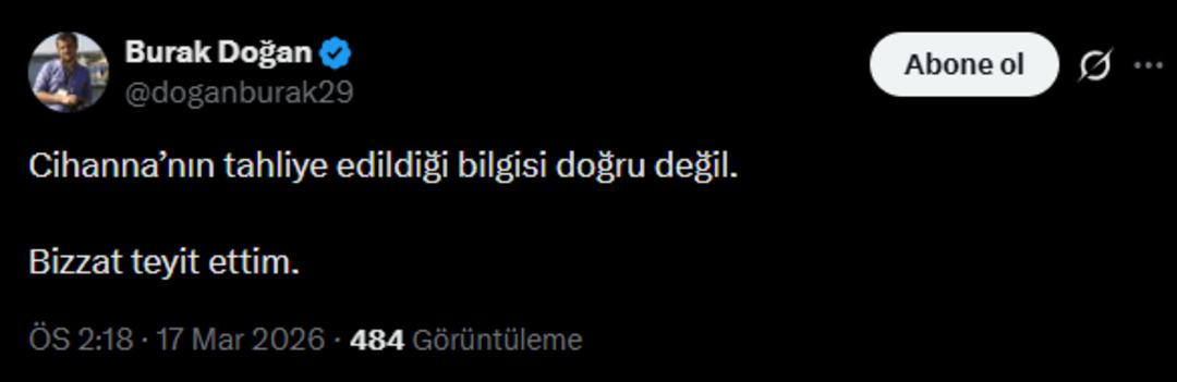 "CİHANNA İDDİASI DOĞRU DEĞİL"Gazeteci Burak Doğan ayrıca Cihanna olarak bilinen Cihan Şensözlü'nün tahliye edildiği iddiasının doğru olmadığını belirtti.