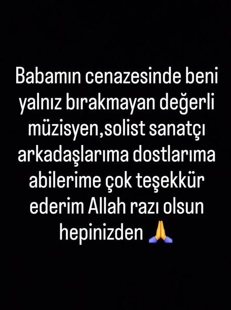 "ALLAH HEPİNİZDEN RAZI OLSUN" Güntav, paylaşımında şu ifadelere yer verdi: Babamın cenazesinde beni yalnız bırakmayan değerli müzisyen ve solist sanatçı arkadaşlarıma, dostlarıma ve ağabeylerime çok teşekkür ederim. Allah hepinizden razı olsun.